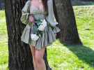 Перед камерою постала в короткій сукні сіро-зеленого відтінку. Аутфіт доповнила розпущеним волоссям, ніжним макіяжем і вишуканими прикрасами.