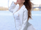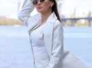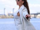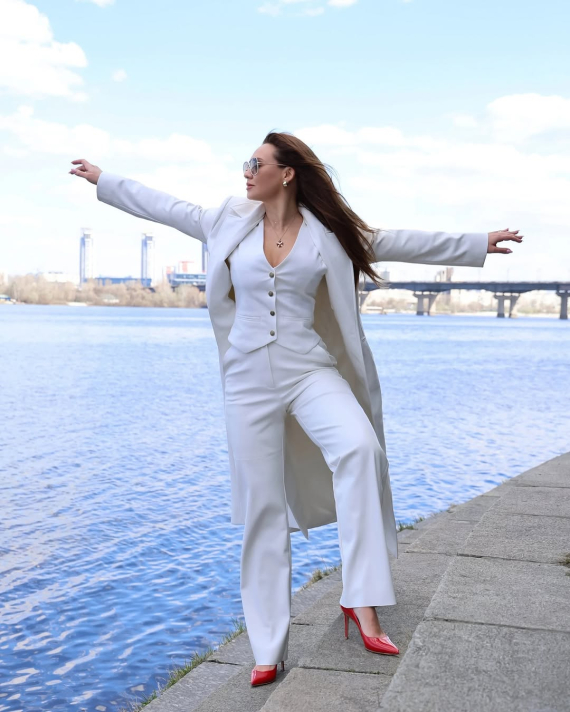 Перед камерою постала в білому костюмі, який складався зі штанів, жилетки та подовженого піджака.