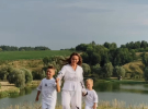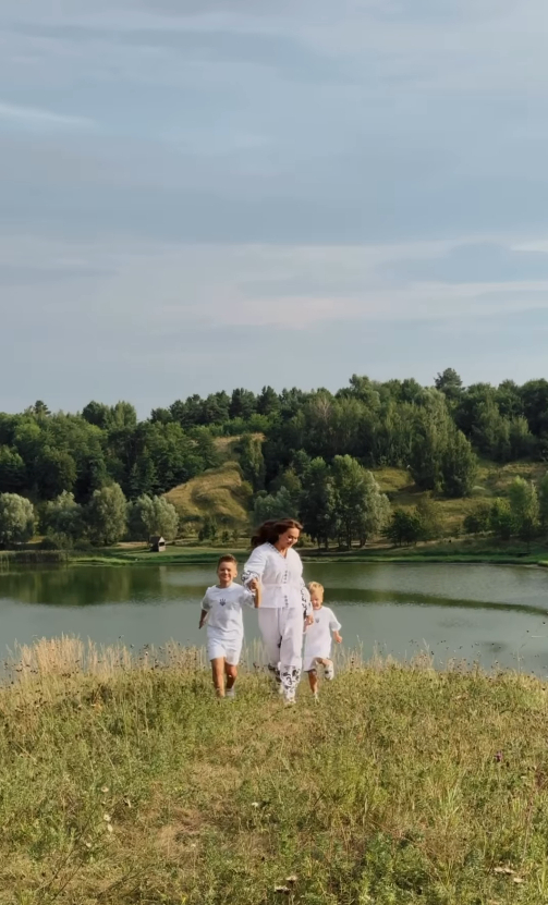 Жінка одягла білий костюм з вишивкою. Гліб і Микита постали перед камерою у білих футболках з гербом і шортах у тон.