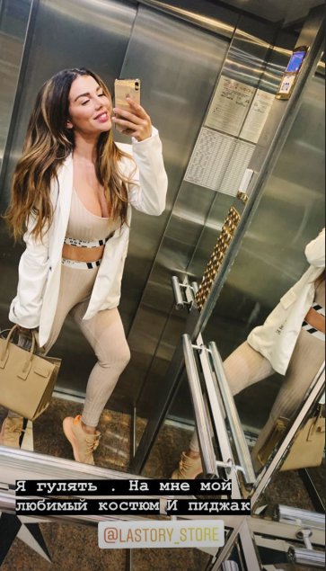 На фото співачка, яка зараз проживає і працює в РФ, приміряла бежевий костюм з топу і легінсів. Одяг обтиснув фігуру знаменитості, а декольте підкреслило пишні груди.