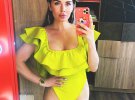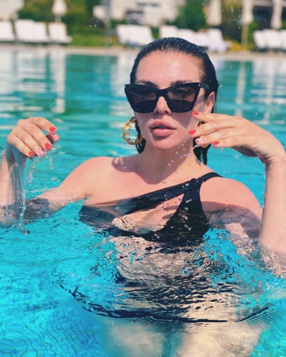 На знімку Анна у чорному асиметричному купальнику та сонцезахисних окулярах насолоджується водними процедурами у одному з пляжних комплексів