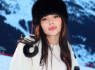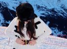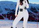 Перед камерою постала в білому комбінезоні, дутиках та хутряній шапці.