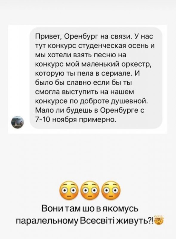 "Привіт, Оренбург на зв'язку. У нас тут конкурс "Студентська осінь" і ми хотіли взяти на конкурс пісню "Мій маленький оркестр", яку ти співала в серіалі. І було б чудово, якби ти могла виступити на нашому конкурсі з доброти душевної. Може, раптом будеш в Оренбурзі 7–10 листопада приблизно", – написали в запрошенні.