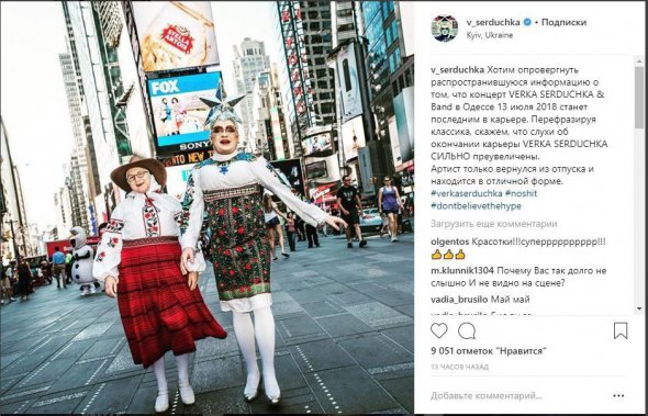 "Хочемо спростувати поширену інформацію про те, що концерт VERKA SERDUCHKA & Band в Одесі 13 липня 2018 стане останнім в кар'єрі. Перефразовуючи класика, скажемо, що чутки про завершення кар'єри VERKA SERDUCHKA дуже перебільшені. Артист щойно повернувся з відпустки і перебуває у відмінній формі", - йдеться у пості.