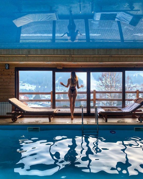 На першому плані світлини - величезний басейн із бірюзовою водою. Леся обернена до об'єктиву спиною. у чорному купальнику, демонструє округлі сідниці у бікіні. Зірка стоїть біля величезного вікна, крізь яке видніється гірський краєвид зимових Карпат.
