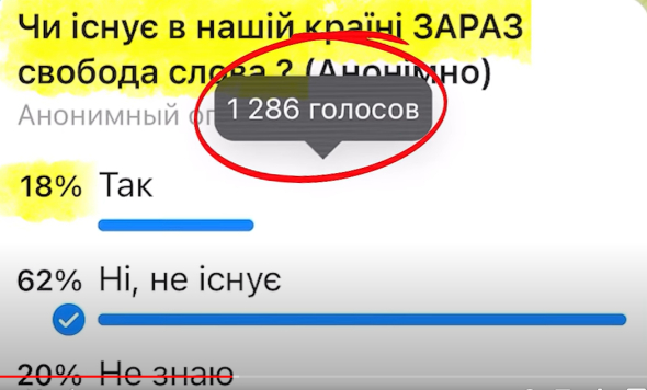 "Чи заслуговують ці висловлювання того, щоб оголосити мене зрадником? Вирішувати все ж таки вам, але я хочу нагадати, що ми все ж таки знаходимося у демократичній країні, де людина має право говорити. Навіть якщо вона не права. Виходячи з того, що мене оголошують зрадником, я задався питанням: "Чи існує в нашій країні взагалі свобода слова?", - продовжив він і опублікував опитування, яке провів серед підписників у Telegram, де 62% проголосували за відповідь: "ні".