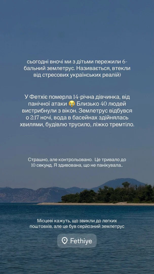 "Сьогодні вночі ми з дітьми пережили 6-бальний землетрус. Називається, втекли від стресових українських реалій. Землетрус відбувся о 2:17 ночі, вода в басейнах здійнялася хвилями, будівлю трусило, ліжко тремтіло. Страшно, але контрольовано. Це тривало до 10 секунд. Я здивована, що не панікувала…Місцеві кажуть, що звикли до легких поштовхів, але це був серйозний землетрус", - поділилася зірка мережі.