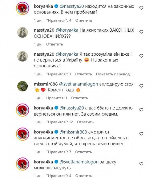 Корячка різко відповіла: "А ти хто така? Німб зніми. Перебуває за кордоном на законних підставах. У чому проблема?".