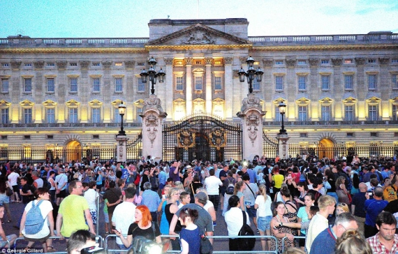 Сотні жителів Лондона почали стікатися до Букінгемському палацу після оголошення про народження спадкоємця британського престолу. Люди тісняться біля огорожі і фотографують виставлене на загальний огляд послання, в якому йдеться про народження герцога Кембриджського, саме такий титул отримав син Вільяма і Кейт.