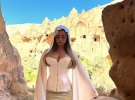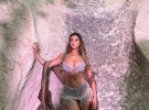 Крім цього зірка наробила світлин на тлі каміння. Модель постала перед камерою у незвичному купальнику з бахромою. Образ доповнила шарфом і довгими чоботами із зав'язками.