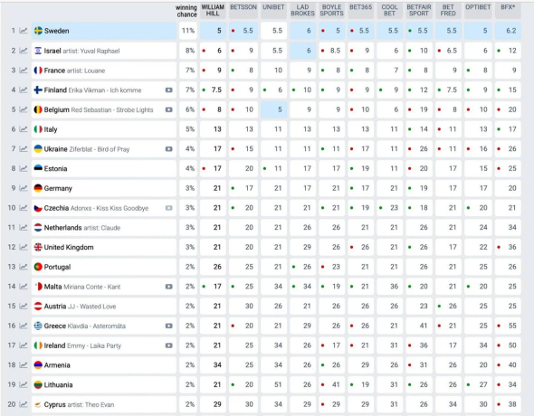 До трійки лідерів увійшли Швеція, Ізраїль та Франція. Четверту сходинку займає Фінлядія, п'яту Бельгія, а шосту - Італія.