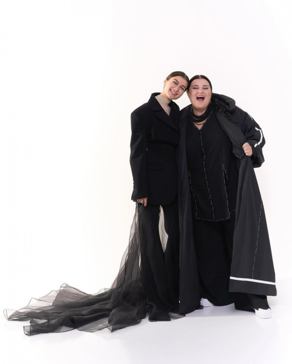 Jerry Heil приміряла подовжені штани палаццо і чорну сукню. Образ доповнила масивним чокером. У другому варіанті alyona alyona позувала у образі total black, який складався з штанів, сукні та куртки зверху. Зірка одягла кеди, а в руках тримала металеву троянду. Jerry Heil показалась у сукні з краваткою і туфлях, під які одягла білі шкарпетки.