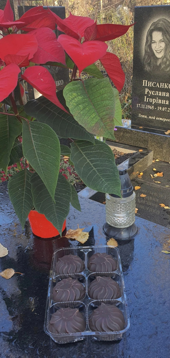 Судячи з кадру, на могилі висаджені червоні квіти. Крім цього, стоять рослини у горщиках. Коханій він приніс зефір у шоколаді. Це був найулюбленіший десерт акторки.