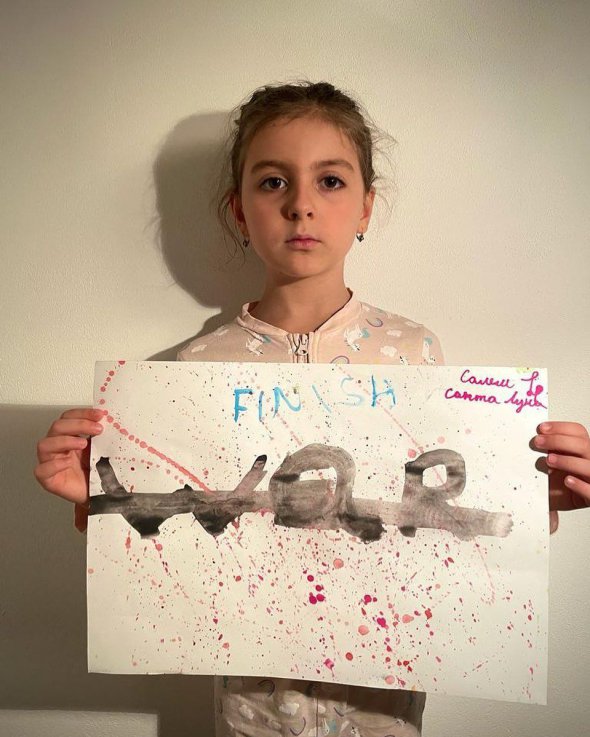 На аркуші дівчина написала англійською слово "війна" та перекреслила його, а зверху додала – "фініш".