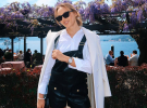 Образ доповнила зібраним волоссям, темними окулярами та чорною сумкою.