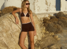 Одягла білизну трендового коричневого кольору, яка складалась з топа та трусів-шортів з білою окантовкою.