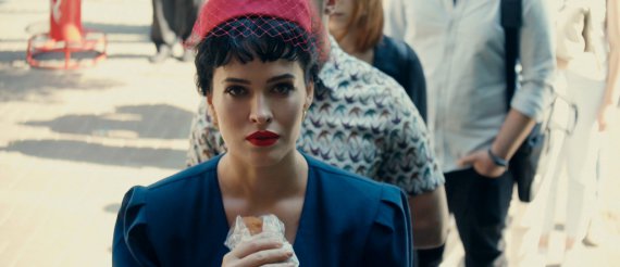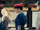 Знаменитість вдягнута у стилі 1960-х років. На її губах яскрава червона помада, волосся прикрите капелюшком з вуаллю. В руках співачка тримала валізу.