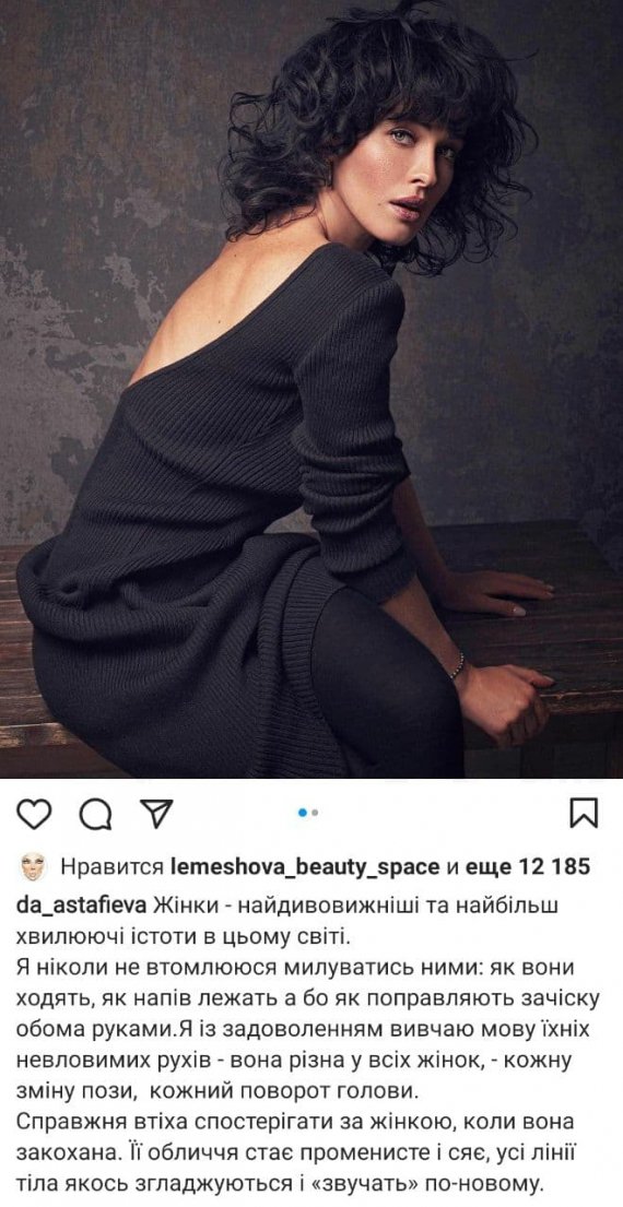 Астаф'єва додала, що особливо любить спостерігати за закоханою жінкою, коли "обличчя стає променистим і сяє, а всі лінії тіла якось згладжуються та "звучать" по-новому".