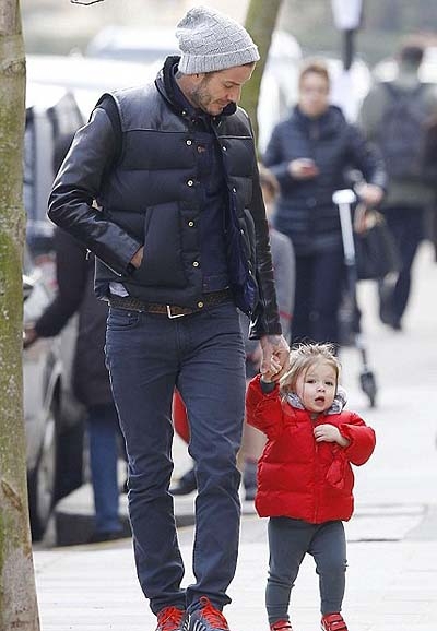 Хто кого вів гуляти, судячи з активних рухів Харпер, незрозуміло. Дівчинка зовсім не боїться папарацці і сміливо дивиться в камери, ну а Девід до них і зовсім давно звик, а тому просто уважно стежив за донькою.