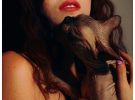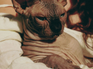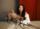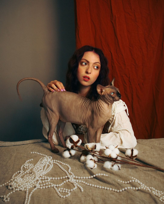 Аутфіт доповнила намистом, розпущеним волоссям і ніжним макіяжем. Поруч з нею стояв кіт породи сфінкс.