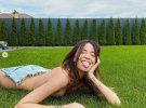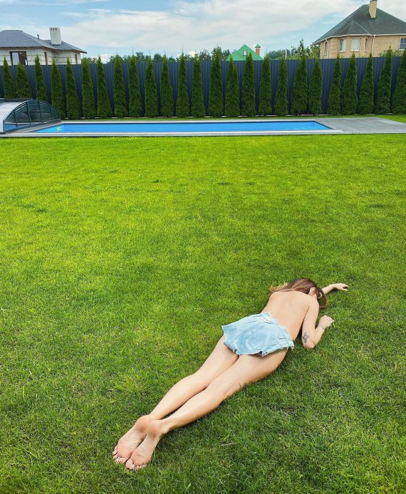 На останній світлині Дорофєєва позувала біля басейну повністю роздягнена, прикривши сідниці короткими джинсовими шортами.