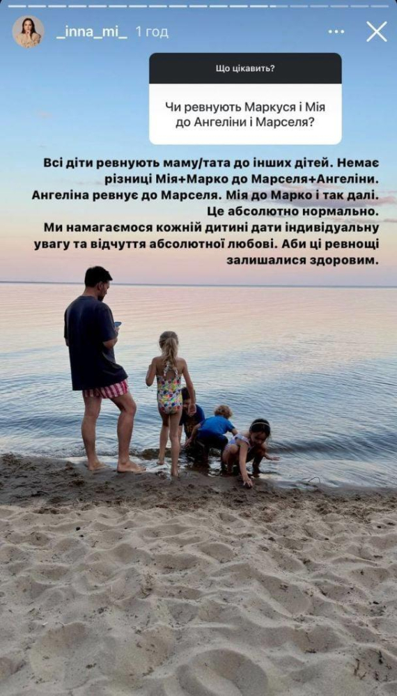 "Усі діти ревнують маму/тата до інших дітей. Немає різниці це Мія або Марко до Марселя або Ангеліни. Ангеліна ревнує до Марселя. Мія до Марка і так далі. Це абсолютно нормально. Ми намагаємося кожній дитині дати індивідуальну увагу і почуття абсолютної любові. Щоб ці ревнощі залишалися здоровими", - сказала Інна.