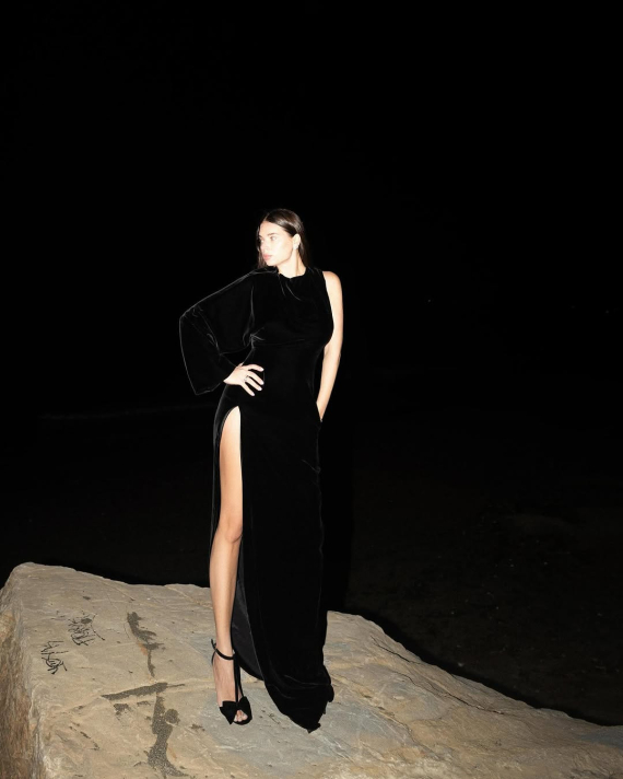Перед камерою блогерка постала в чорній оксамитовій сукні довжини максі з глибоким вирізом на стегні.