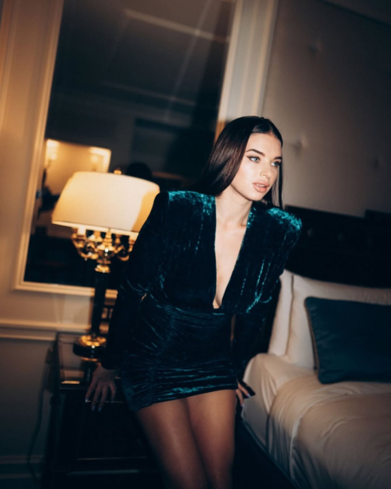 Одягла оксамитову мінісукню з дуже глибоким декольте, яка підкреслила її ідеальну фігуру.
