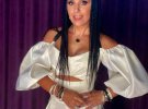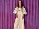 Наряд білосніжного кольору артистка доповнила аксесуарами - на її руках багато різних браслетів, а на шиї - медальйон. Вона також зробила зачіску з безлічі кісок і одягла цікаві сережки у вигляді шпильки.