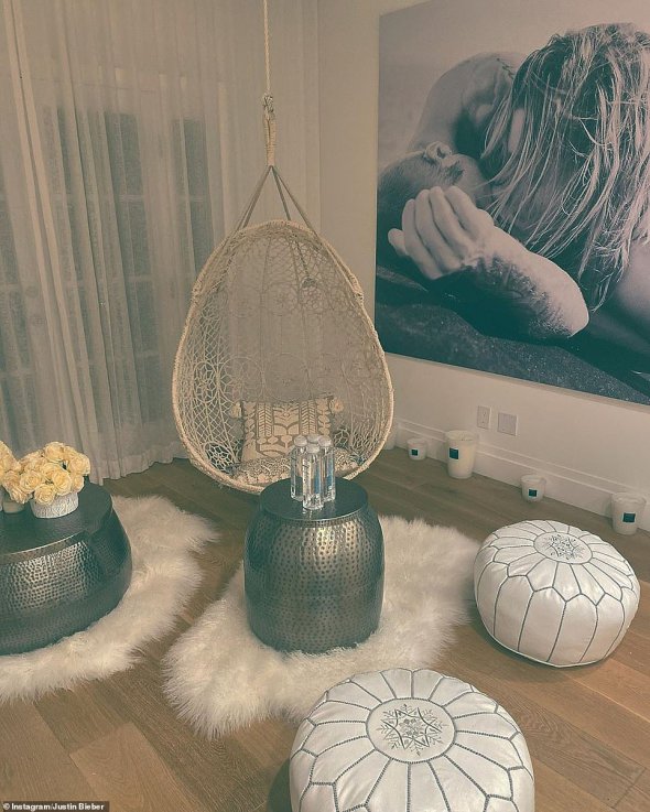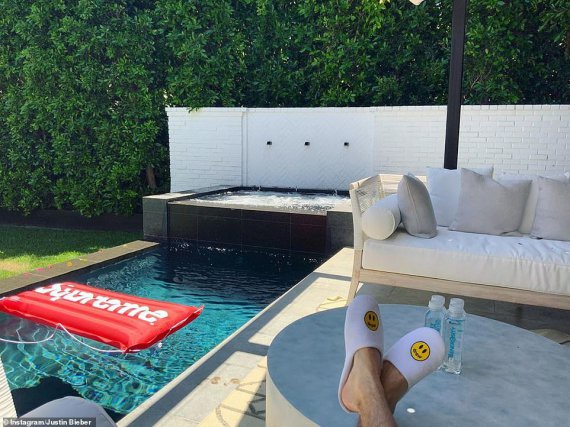 На деяких фотографіях видно ноги Бібера, ніби він на відпочинку. Співак продемонстрував басейн, який є у дворі маєтку, вінтажні ігрові автомати, дорогу техніку. В одній з кімнат на стіні висить величезний портрет подружжя.