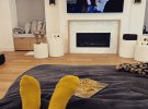Головна спальня оформлена у кремових відтінках з великим телевізором, вбудованим каміном, віконними сидіннями та масками сну Louis Vuitton.