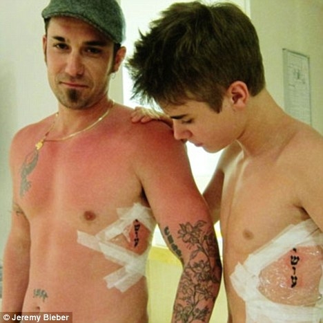 Навесні Джастін Бібер зробив собі татуювання в районі ребер. А днями канадський співак виклав у мережу знімки самого процесу. Виявляється батько Бібера Джеремі зробив собі таке саме татуювання, пише The Daily Mail.