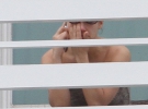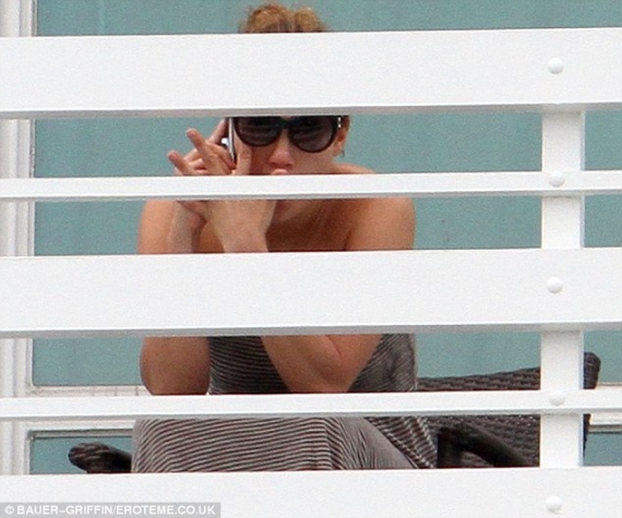 Папараці зняли Дженніфер Лопес під час її розмови зі своєю дочкою по мобільному телефону. Співачка була помічена на балконі готелю в Маямі. 42-річна знаменитість прилетіла в місто для зйомок у знаменитого фотографа Маріо Тестіно, який роздягнув актрису до білого купальника зі сміливими вирізами.