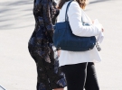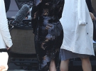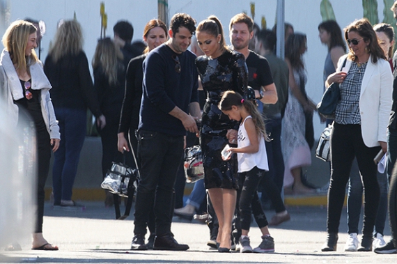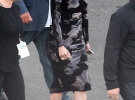 Взявши з собою на зйомки дочку Емму, вона з'явилася на публіці в чорній облягаючій блискучій довгій сукні, на підборах і з гладко зачесаним у хвіст волоссям.