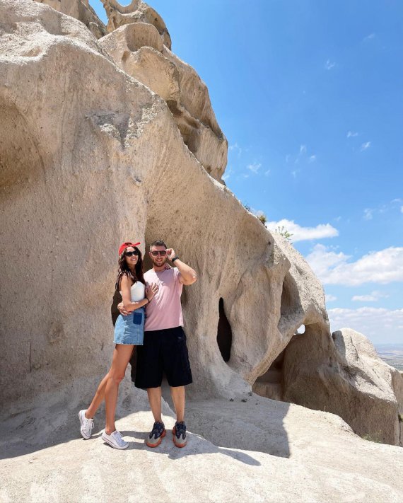 Пара ділиться ніжними світлинами з Каппадокії в Instagram. На знімку Богдан позувала в білій майці й мініспідниці, хизуючися стрункими ногами. Заливако постав у чорних шортах і рожевій футболці.