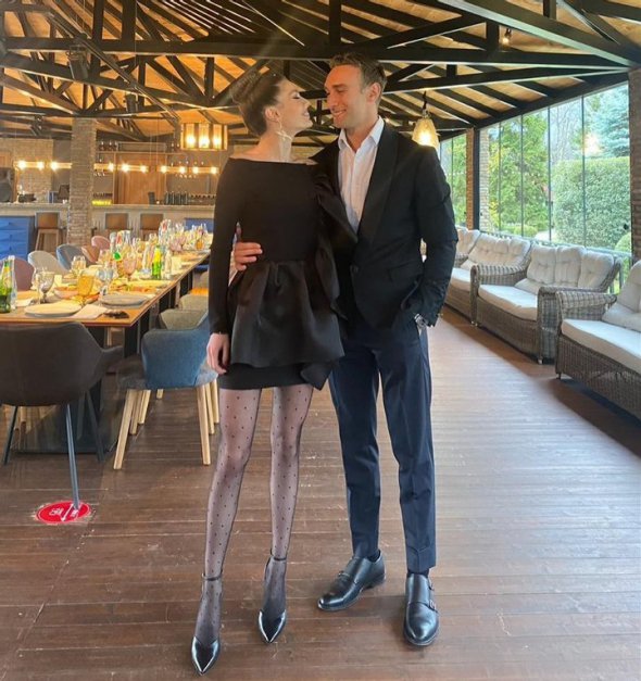 Кадр зробили під час святкування в розкішному ресторані. На ньому ексхолостяк постав у темно-синіх штанах, класичному чорному піджаку з атласним лацканом і шкіряних туфлях. Його обраниця одягла обтислу мінісукню чорного кольору з об'ємними атласними вставками. Образ довершила колготками в горох, туфлями на високих підборах, а довге волосся зібрала у високий пучок.