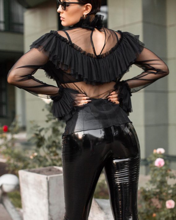Для фотосесії артистка вдягла темну прозору блузу та латексні штани власного бренду. На одній із світлин Maruv ефектно позує спиною до камери, хизуючись апетитними формами.