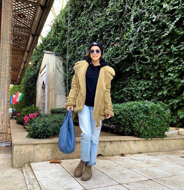 Кароліна на фото позує в звичайному вуличному одязі: утепленій дублянці, джинсах бойфрендах, масивних черевиках і шапці.