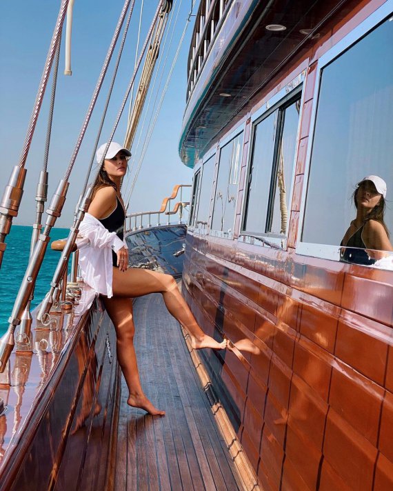На фото Саніна позує в білій сорочці, чорно-білому злитому купальнику та білій кепці. Влаштувала фотосесію на яхті. На одній зі світлин виконавиця постала із сином 5-річним Данилом.