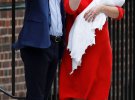 Цього разу Кейт Міддлтон вийшла з госпіталю в сукні й туфлях на підборах і виглядала трохи втомленою. Малюк, чиє ім'я поки не оприлюднили, був загорнутий в білий конверт для новонароджених і солодко спав на руках у своєї матері.