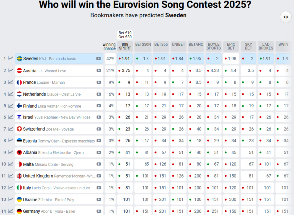Станом на зараз букмекери прогнозують Україні 13-те місце. До трійки перших входять Швеція, Австрія і Франція.
