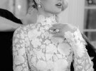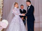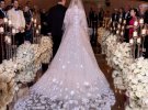 Для першого весільного танцю модель вбралася в пишну сукню зі спущеними плечима від Galia Lahav. А блискучу сукню, яка підкреслила струнку фігуру зірки, підготувала від Pamella Roland.