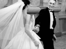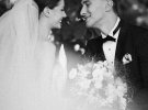 Перед камерою чоловік постав у чорному смокінгу. Його кохана позувала у розкішній білій сукні. Образ доповнила фатою з довгим шлейфом, зібраним у низький пучок волоссям і ніжним макіяжем.
