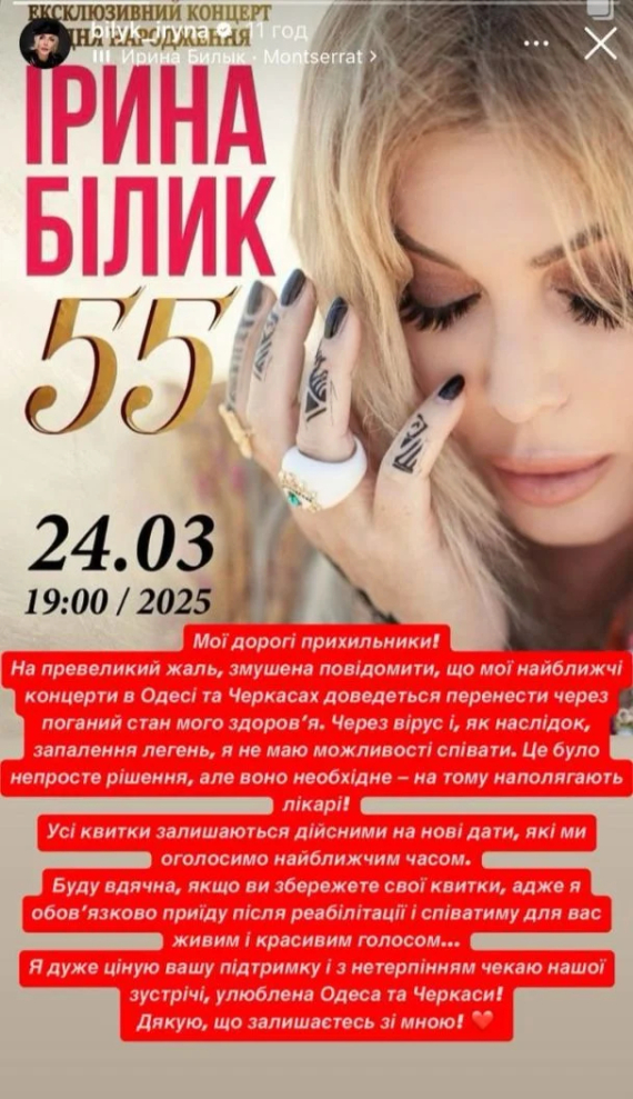 "На превеликий жаль, мої найближчі концерти доведеться перенести через поганий стан мого здоров'я. Через вірус і, як наслідок, запалення легень, я не маю можливості співати. Це було непросте рішення, але необхідне - на цьому наполягають лікарі. Я обов'язково приїду після реабілітації і співатиму для вас живим і красивим голосом", - написала артистка.