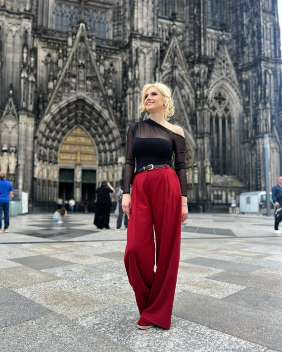 Зірка зробила кадри на тлі місцевого собору. Перед камерою постала в червоних штанах і напівпрозорому чорному топі.