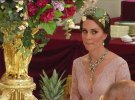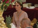 Герцогиня Кембриджська з'явилася на банкеті в ніжно-рожевій вечірній сукні від Marchesa. Глибокий V-подібний виріз наряду підкреслював намисто на її грудях, інкрустоване рубінами. Аксесуар належав королеві Єлизаветі II, яка в різні роки одягала його на урочисті прийоми. Голову Кейт прикрашала інша фамільна коштовність - тіара "Любовний вузол" (Lover's Knot), яку Єлизавета II піднесла принцесі Діані як весільний подарунок.