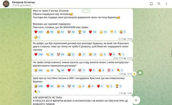 У своїх Telegram-каналах жінки наводили аргументи, але особистого контакту не відбувалося. Сьогодні, 26 квітня, Катерина зазначила, що обрала собі подарунок на 25-річчя. За словами блогерки, Остапчук подарує їй частину будинку, який будував з Горняк.