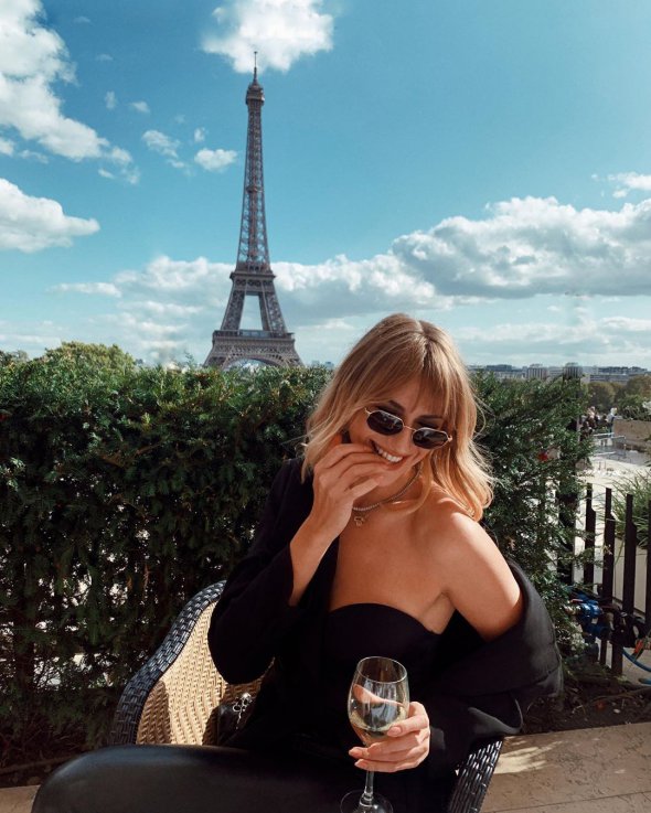 На знімках Леся в чорному топі, сорочці та чорних шкіряних штанях сидить на літній терасі кафе з келихом білого вина. На жінці - чорні сонцезахисні окуляри. На тлі світлини - Ейфелева вежа.