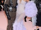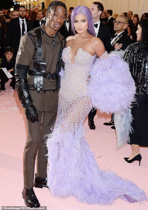 Для костюму Кайлі обрала свій образ на благодійному вечорі Metropolitan Museum, який пройшов у травні цьогоріч. Тоді вона одягла напівпрозору лілову сукню від Versace з фіолетовим пір'ям. Під ним мала бежеве боді. Волосся пофарбувала у фіолетовий колір.