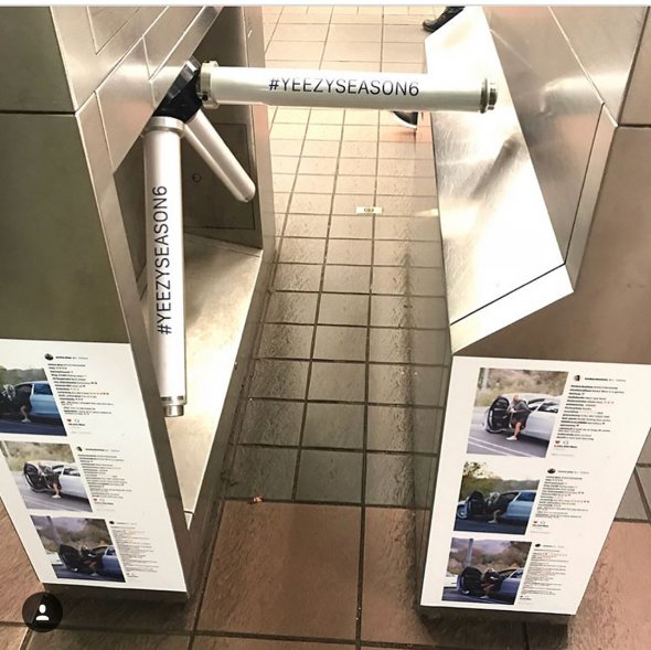 Хештеги #YeezySeason6 наліплені на пропускних турнікетах. На знімках зображена Кардашьян та її клони в об'єктивах папараці. Також на скріншотах вказана кількість лайків і надруковані позитивні відгуки її підписників.
